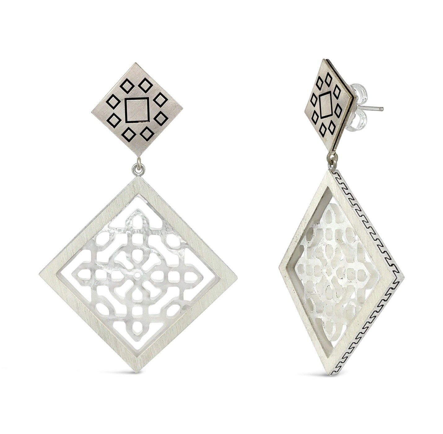 The Nava White Earrings embody harmony in form and material. Handcrafted in sterling silver, their square shape is inlaid with luminous white mother-of-pearl, where iridescent tones shift softly with every movement.